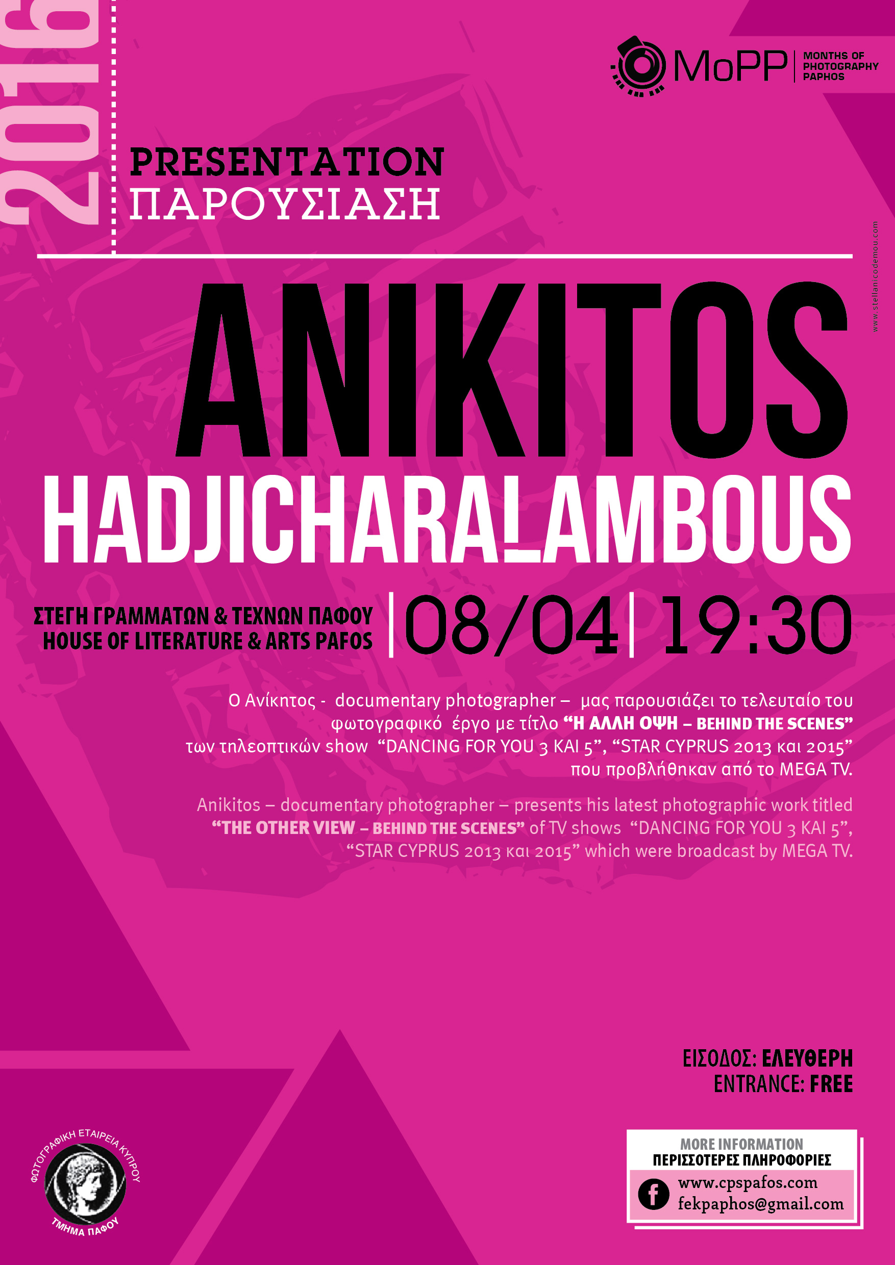 Anikitos – documentary photographer – presents his latest photographic work “THE OTHER VIEW – BEHIND THE SCENES” of TV shows “DANCING FOR YOU 3 and 5”, “STAR CYPRUS 2013 and 2015” which were broadcasted by MEGA TV.