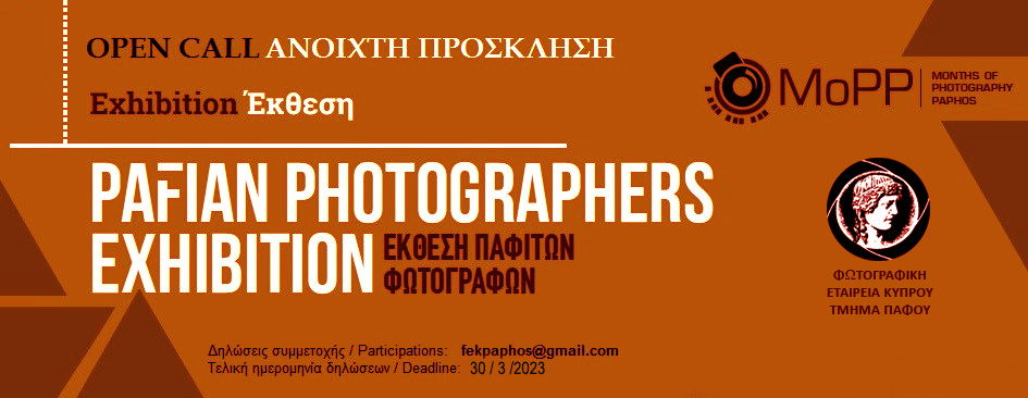 2. Τα ηλεκτρονικά αρχεία θα πρέπει να ονομαστούν με το ονοματεπώνυμο του φωτογράφου και αριθμημένα από το 1 –4 . Π.χ. GiotaKyriakou1.jpg3. Οι ενδιαφερόμενοι (μέλη και μη μέλη) μπορούν να δηλώσουν συμμετοχή με αποστολή μηνύματος στο fekpaphos@gmail.com ή στην ομάδα μας στο facebook ή στα τηλέφωνα 99428868, 99807247.4. Αφού εγκριθεί η συμμετοχή, οι φωτογραφίες θα πρέπει να αποσταλούν στο email: fekpaphos@gmail.com μέχρι την Κυριακή 2/4/2023. Τονίζεται ότι ΔΕΝ ΘΑ ΔΟΘΕΙ ΠΑΡΑΤΑΣΗ. (Η αποστολή μπορεί να γίνει και με WeTransfer). Με την αποστολή των 4 φωτογραφιών του/της ο/η φωτογράφος αποδέχεται ότι εφόσον αυτές αναρτηθούν στην 8η Έκθεση Παφιτών Φωτογράφων θα μπορούν να πωληθούν στην τιμή των €30 η καθεμιά και ότι όλα τα καθαρά έσοδα από την πώλησή τους θα δοθούν για ενίσχυση του ταμείου Επίσης, επιτρέπει όπως κάθε μία από τις αναρτημένες φωτογραφίες του/της θα μπορεί να εκτυπωθεί και πωληθεί μέχρι 5 φορές. Τα εγκαίνια της έκθεσης θα γίνουν την Παρασκευή 21 Απριλίου στην Παλιά Ηλεκτρική και θα έχει διάρκεια 3 μέρες. The CPS-Paphos announces the 8th Photo Exhibition of PAFIAN Photographers The main purpose of this event is to give the opportunity to photographers living in (or from) Paphos to present their work to the public through an organized group exhibition. Understanding the difficulties that anyone can encounter in organizing a personal photo exhibition and knowing that a lot of our fellow citizens are engaged in photographic art, we decided to start this event five years ago.This year the exhibition will be organized in collaboration with the Volunteerism Coordinate Council of Kato Paphos for the benefit of the Children’s Club and the photos will be sold for €30 each to raise money for the institution’s purposes.Photographers living in the province of Paphos or are from Paphos (members and non-members of the CPS) can participate in the exhibition.The CPS PAPHOS will provide materials for the placement of photographs (frames or surfaces), print the photos, provide the space and organize the opening of the exhibition (reception, speeches). The 4 printed photographs will be handed to the photographers after the end of the exhibition. The choice for the photos belongs exclusively to each photographer. Each photographer can participate with 1 to 4 photographs. A priority order will be met based on the date of submission and payment of the application fees. The right to participate (including all the services listed in the previous paragraph) in the group exhibition is:25 Euro for CPS members (2023 renewals)35 Euro for non membersParticipants can take their printed photos after the exhibition (included in the participation fee).If interested please send a message at email: fekpaphos@gmail.com or by phone (99428868, 99807247).You will get a reply if there are still spaces left.Important notes:1. The files should be in high resolution. The shortest side should be more than 2400pixels at 300dpi and image sizes 30X40 or 30X45cm.2. The files should be named as follows: Name.Surname.Number.jpg. For example: Giota.Kyriakou.1.jpg.3. Photos should be sent at fekpaphos@gmail.com following entry verification. 4. The exhibition’s opening will take place on Friday 21st April at the Old Electricity Hall.5. By sending their photos the photographers automatically accept that their photos can be sold for the purposes of the philanthropic institution at the price of €30. Also, they declare that each photo can be printed and sold up to 5 copies.6. The photographer must be the intellectual creator of the works he/she will submit and will be responsible (licensed) for the persons depicted. Photos with offensive content will not be accepted.