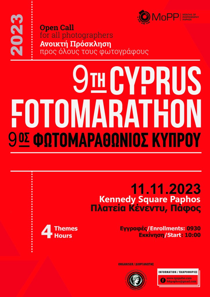 Μετά τις προηγούμενες επιτυχημένες διοργανώσεις, η Φωτογραφική Εταιρεία Κύπρου – Τμήμα Πάφου διοργανώνει τον 9ο Φωτομαραθώνιο Κύπρου το Σάββατο 11 Νοεμβρίου 2023.